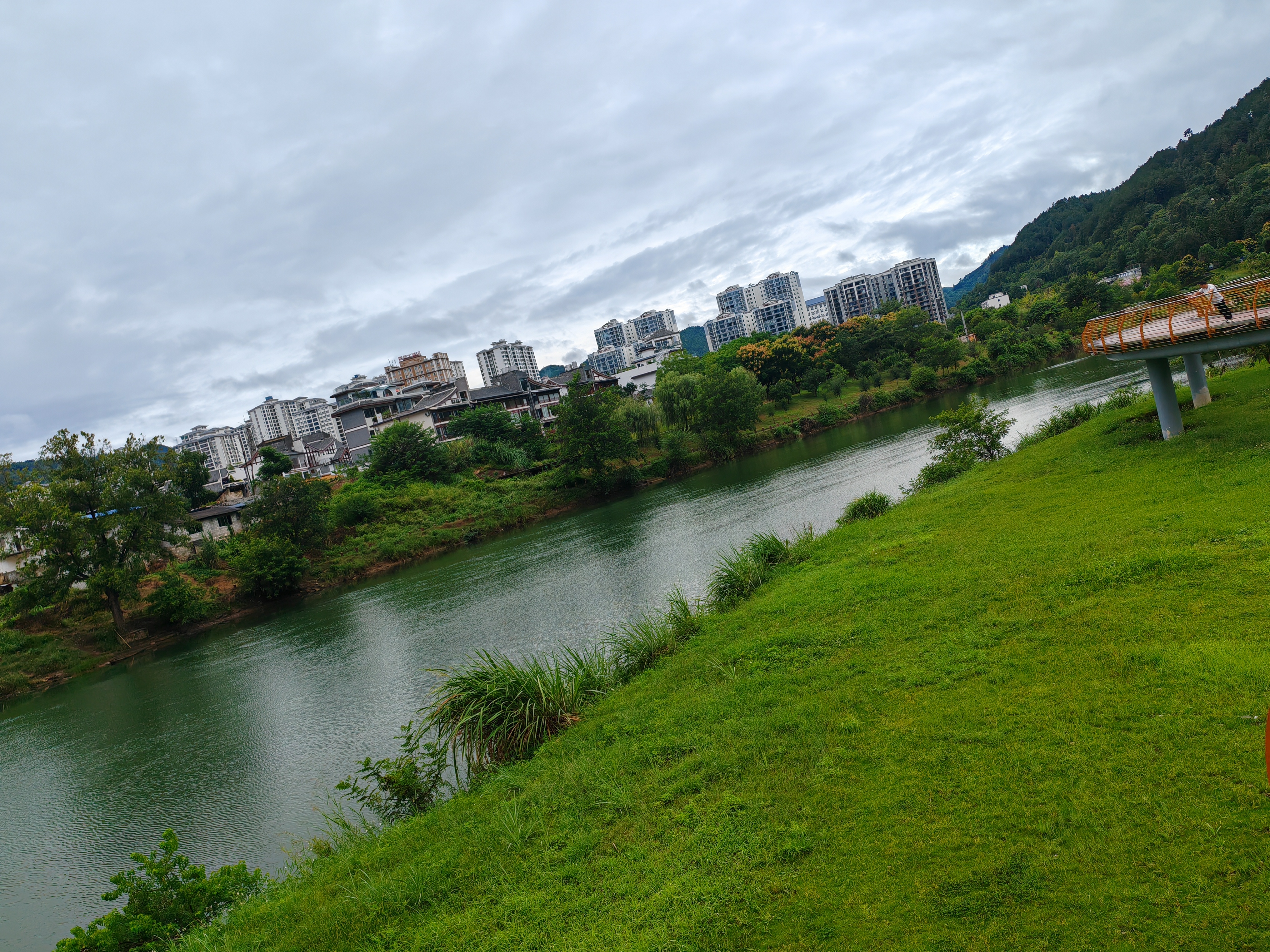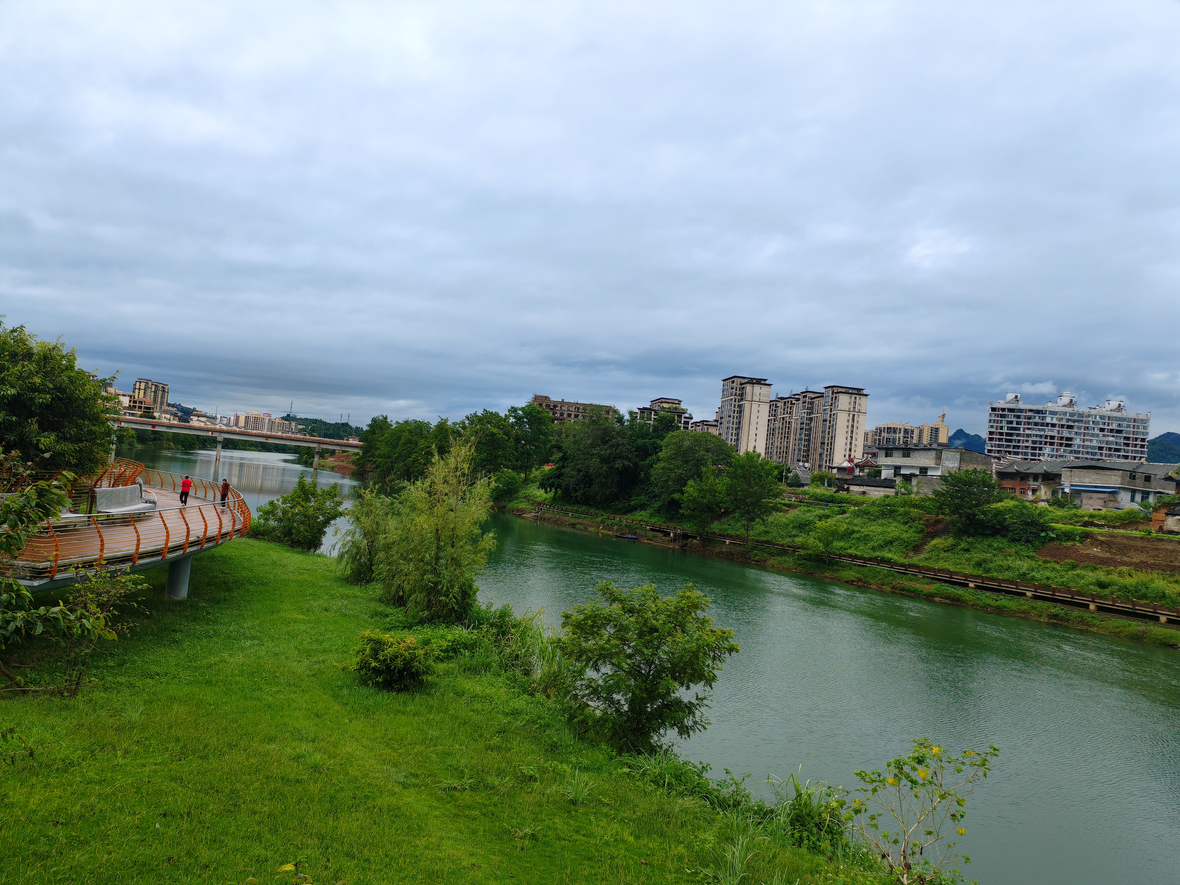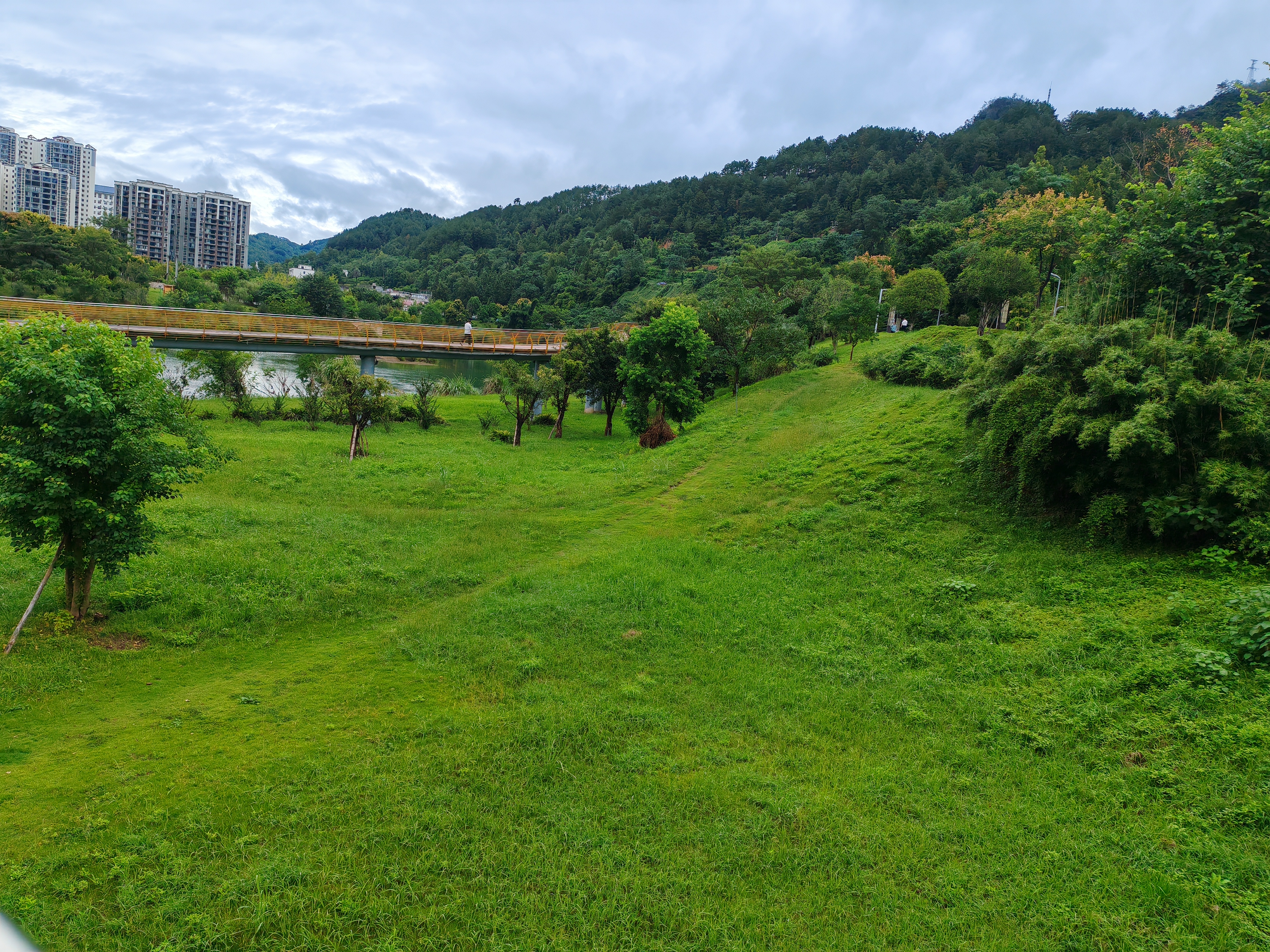 河风裹着草木的潮气漫过来[emoji] 对岸的楼群浸在云里,脚下的草地软得像团绿绒,连廊上的身影慢慢晃,把这阴天的闲懒都晃成了日常。