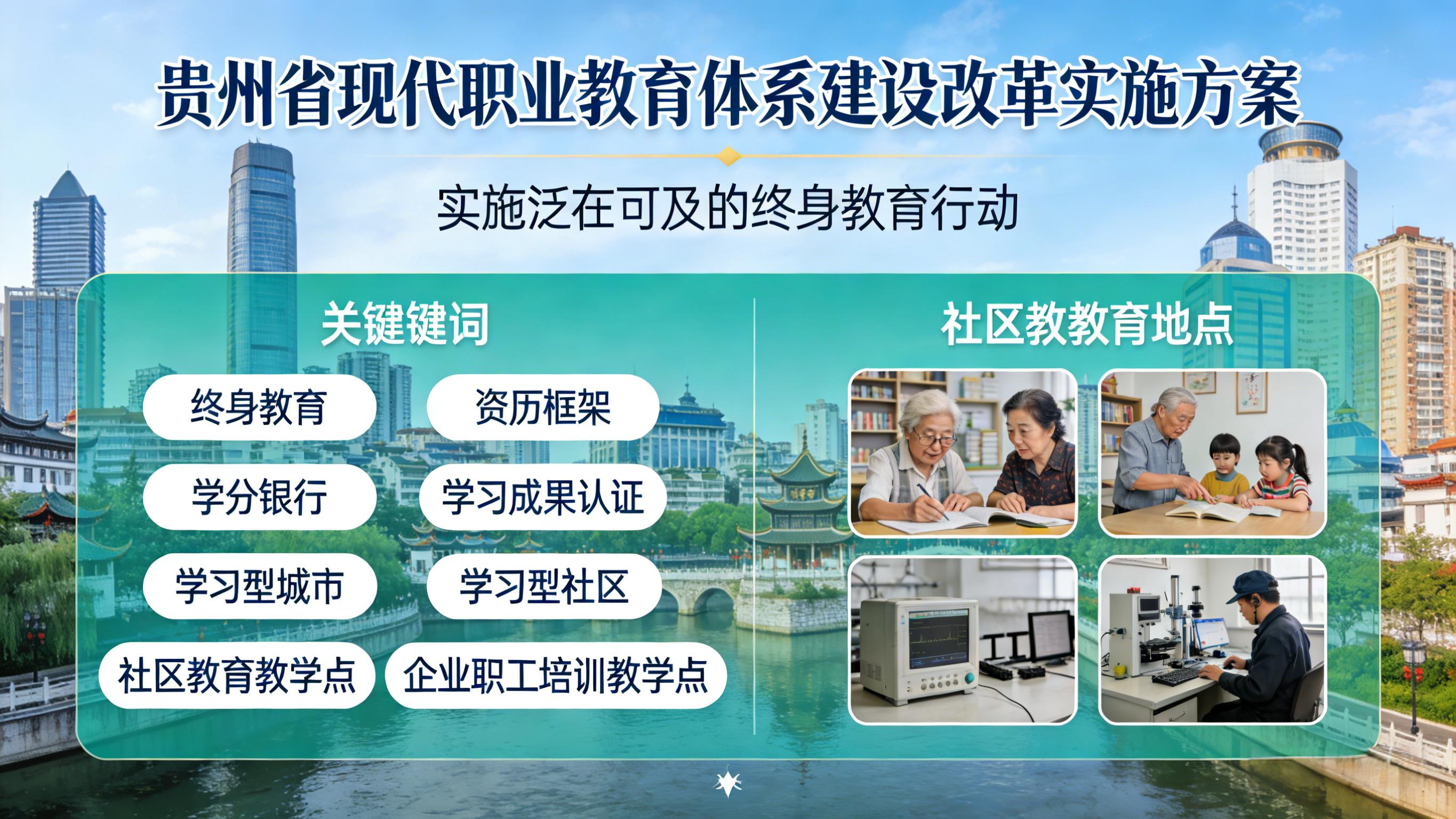 《贵州省现代职业教育体系建设改革实施方案》第(五)实施泛在可及的终身教育行动:提升公共学习服务水平。加快构建以资历框架为基础、以学分银行为平台、以学习成果认证为重点的终身学习制度。支持各市(州)建设学习型城市,在全省布局建设100个以上学习型社区,打造100个以上社区教育教学点,支持校企共建100个以上企业职工培训教学点,引导各类学校向社会开放学习资源,与社区、企业融合,服务终身学习。